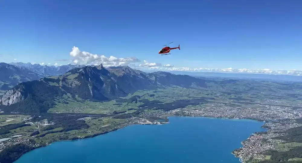 The highlight of your day will be an unforgettable helicopter ride over the places you have visited. The driver-guide will take you to the helicopter station, where friendly staff will welcome you. Following a safety briefing, board the helicopter for a thrilling 26-minute flight over Stockhorn, Lake Thun, and the castles of Spiez and Oberhofen. Enjoy spectacular views of the Eiger, Mönch, and Jungfrau mountains in the distance. Alternatively, fly back via Justistal and Emmental.